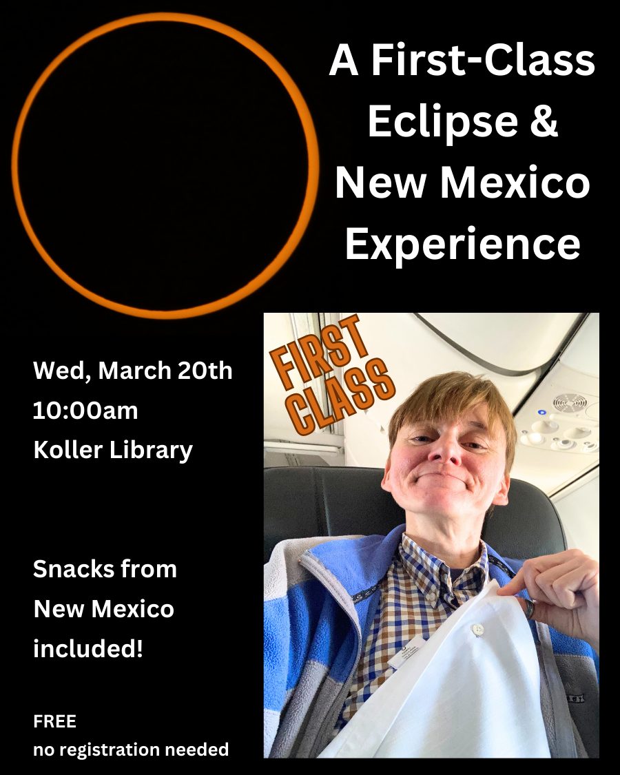 Sarah is doing a presentation about her trip to New Mexico for the annular eclipse. Hear about this, and about all the other experiences she had along the way (first-class service, A LOT of bats at a certain famous cave, and close encounters with aliens). Plus, you know there will be THEMED SNACKS! New Mexico food!
