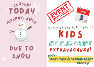 We are closed today, December 29th, due to vast amounts of snow. The holiday craft extravaganza and story hour have been moved to FRIDAY, January 2nd. See more here.